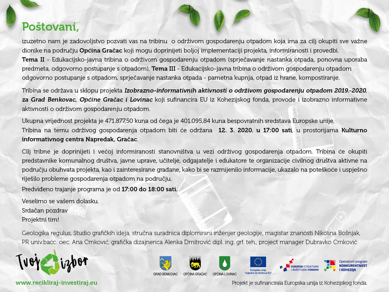 ODRŽANA 2. TRIBINA IZOBRAZNO-INFORMATIVNIH AKTIVNOSTI O ODRŽIVOM GOSPODARENJU OTPADOM 2019.-2020. ZA GRAD BENKOVAC, OPĆINU GRAČAC I OPĆINU LOVINAC 12.3.2020 u 17:00 sati u prostorijama Kulturno-informativnog centra Napredak, Gračac